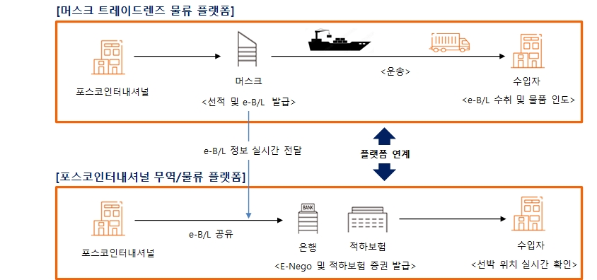 포스코인터내셔널이 이번에 도입한 방식은 종이가 필요 없는 디지털방식이다. e-B/L은 글로벌 운송사 머스크가 개발한 물류 플랫폼 ‘트레이드렌즈’를 통해 발급됐다. 이후 포스코인터내셔널이 한국무역정보통신사(KTNET)와 협업한 ‘무역/물류 플랫폼’에서 우리은행과의 e-Nego와 DB손해보험의 적하보험 발행이 진행됐다.