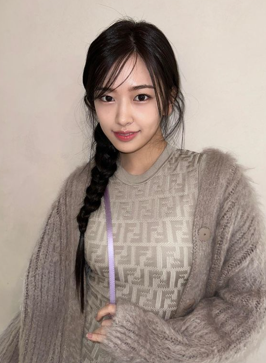 사진 속 안유진은 니트 원피스에 카디건을 입고 카메라 앞에서 포즈를 취하고 있다.