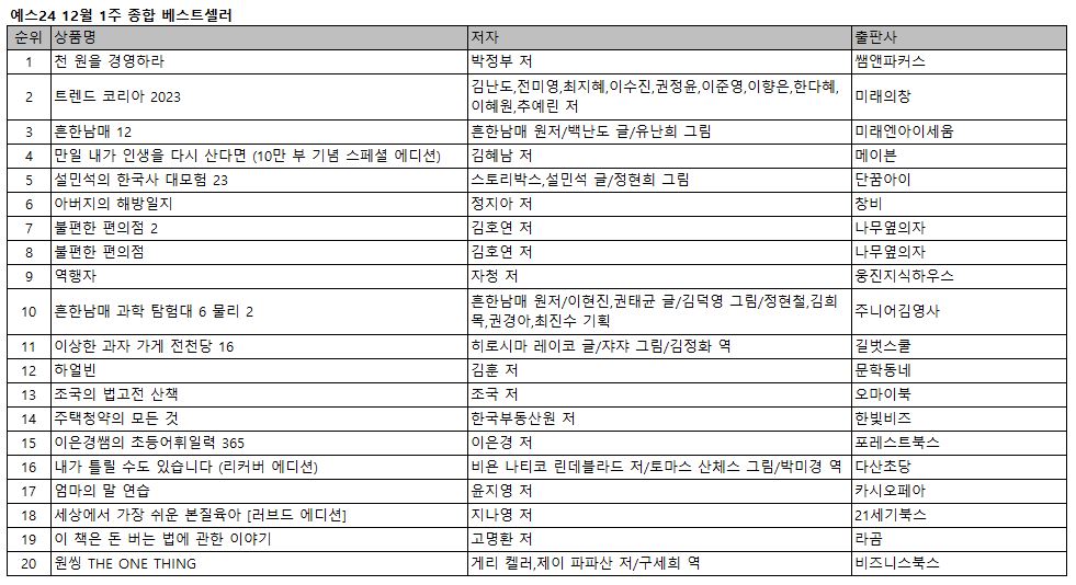 [아시아경제 서믿음 기자] 예스24 12월 1주 종합 베스트셀러에는 창업주 박정부 회장의 국민가게 다이소 25년 성공 스토리 '천 원을 경영하라'가 전주보다 두 계단 올라 1위를 기록했다. 검은 토끼의 해 멋진 도약을 준비하는 소비 전망서 '트렌드 코리아 2023'은 2위에 자리했고, 마음이 포근해지는 '흔한남매'의 새로운 일상 이야기 '흔한남매 12'는 전주 대비 한 계단 상승해 3위에 올랐다. 10만 부 판매 돌파 기념 스페셜 에디션으로 새롭게 펴낸 김혜남 저자의 '만일 내가 인생을 다시 산다면'은 4위, 누적 판매 500만 부를 돌파한 '설민석의 한국사 대모험' 시리즈 신간 '설민석의 한국사 대모험 23'은 출간 직후 5위에 올랐다.