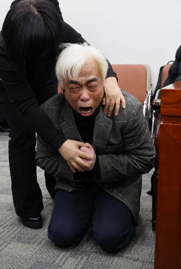 이태원 참사로 숨진 배우 고(故) 이지한씨 아버지는 1일 국회에서 열린 '이태원 참사 국정조사특별위원회' 간담회에서 무릎을 꿇은 채로 오열했다. 여당인 국민의힘 의원들이 불참한 가운데 열렸다. 이날 간담회는 국회의원들이 유족들과 만나 의견을 구하는 취지에서 마련됐다.
