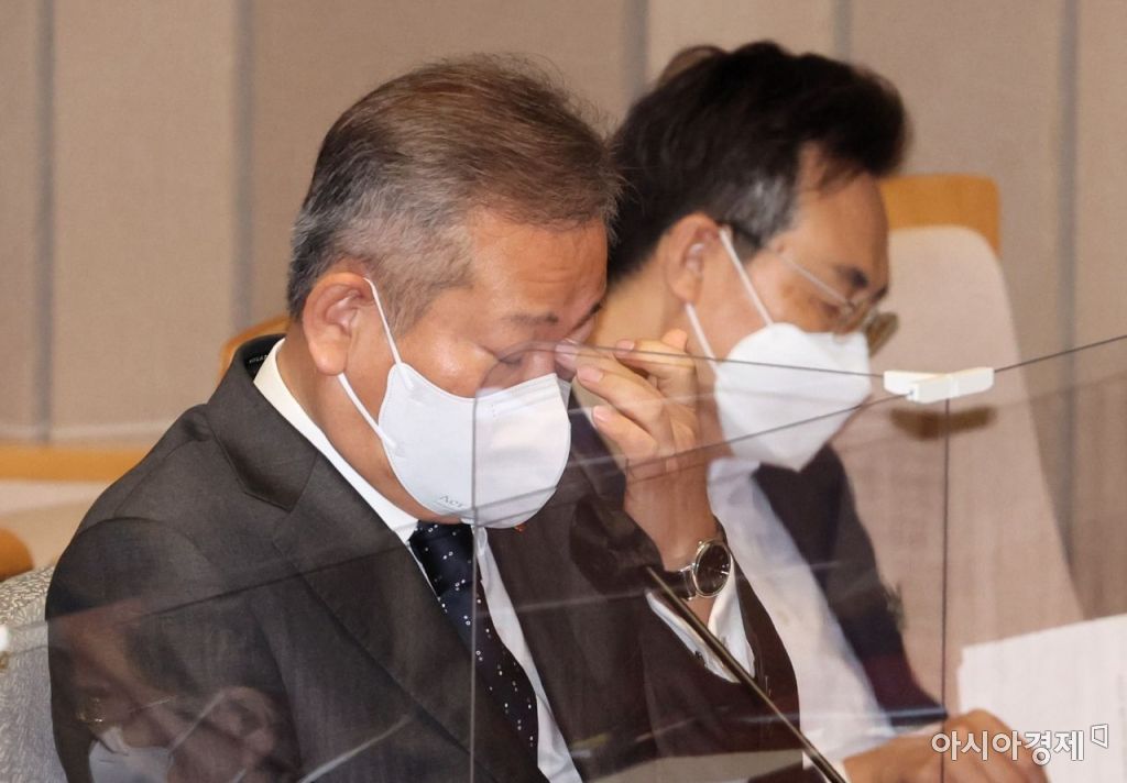 이상민 행정안전부 장관이 지난달 15일 국회에서 열린 비경제분야 예산결산특별위원회 전체회의에 출석, 회의 도중 피곤한듯 눈을 비비고 있다./윤동주 기자 doso7@