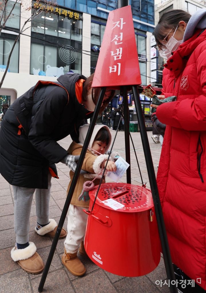 매서운 동장군이 기승을 부린 4일 서울 중구 명동에서 시민들이 구세군 자선냄비에 성금을 넣고 있다./김현민 기자 kimhyun81@