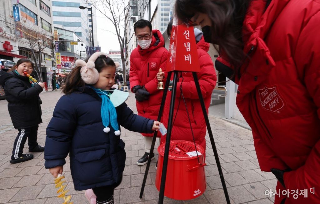 매서운 동장군이 기승을 부린 4일 서울 중구 명동에서 어린이들이 구세군 자선냄비에 성금을 넣고 있다./김현민 기자 kimhyun81@
