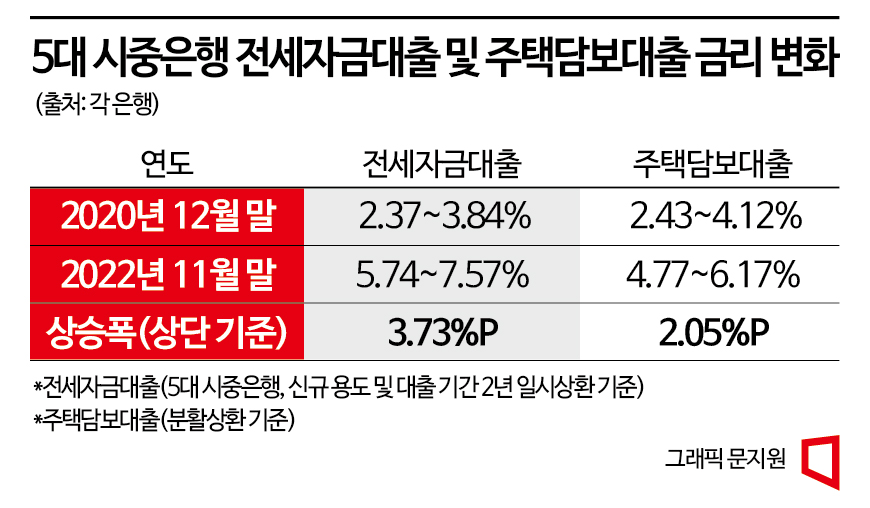 [아시아경제 심나영 기자, 이민우 기자, 송승섭 기자] 경기도 동탄에 사는 직장인 김영환씨(38)는 지난해 8월 연 3.44%에 전세자금대출로 3억원을 빌렸다. 이때까지만 해도 매월 납입해야 할 이자는 86만원 수준이었다. 하지만 지난해 말부터 기준금리가 가파르게 오르자 점차 두려움이 커졌다. 6개월마다 돌아오는 금리 조정 시기에는 여지없이 1%씩 올랐다. 어느새 대출금리는 5% 중반까지 치솟았고 매월 내야 하는 이자는 140만원에 육박하게 됐다.