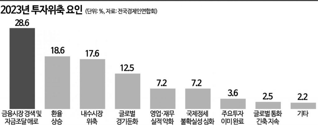 기업들은 내년도 투자규모를 늘리기 어려운 가장 큰 이유로 금융시장 경색 및 자금조달 애로(28.6%)를 꼽았다. 원·달러 환율상승(18.6%), 내수시장 위축(17.6%) 등이 그 뒤를 이었다. 실제로 기업들은 기준금리 인상에 따른 시중금리의 급격한 상승으로, 투자 자금 확보에 어려움을 겪고 있다. 지난달 말 기준 기업어음(CP) 금리는 5.51%로 2009년 금융위기(5.66%) 이후 최고 수준이다.