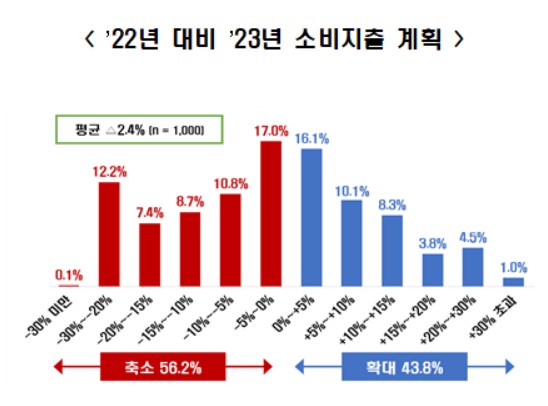 6일 전국경제인연합회가 여론조사기관 모노리서치에 의뢰해 전국 만 18세 이상 국민 1000명을 대상으로 '2023년 국민 소비지출 계획'을 조사한 결과 응답자의 56.2%는 내년 소비지출을 올해 대비 축소할 계획이라고 밝혔다. 전경련은 내년 가계 소비지출이 올해에 비해 평균 2.4% 감소할 것으로 내다봤다.