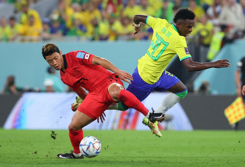 6일(한국시간) 카타르 도하 974스타디움에서 열린 2022 카타르 월드컵 16강전 대한민국과 브라질의 경기. 대표팀 황희찬이 브라질 비니시우스 주니오르와 볼다툼을 벌이고 있다. [이미지출처=연합뉴스]