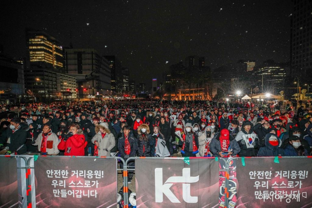 2022 카타르 월드컵 대한민국과 브라질 16강 경기가 진행되고 있는 6일 서울 종로구 광화문 광장에 마련된 거리응원에 참가한 시민들이 경기를 지켜보고 있다./강진형 기자aymsdream@