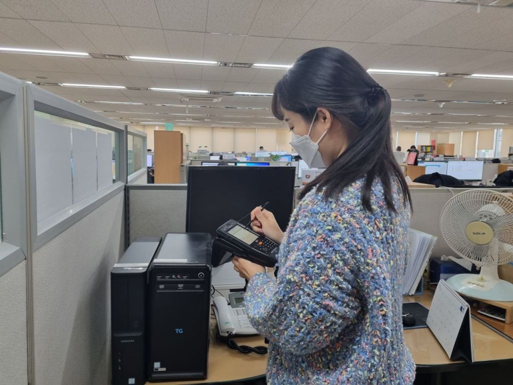 소상공인시장진흥공단 직원이 공단 본부에서 전자태그(RFID) 리더기로 물품을 조사하고 있다.