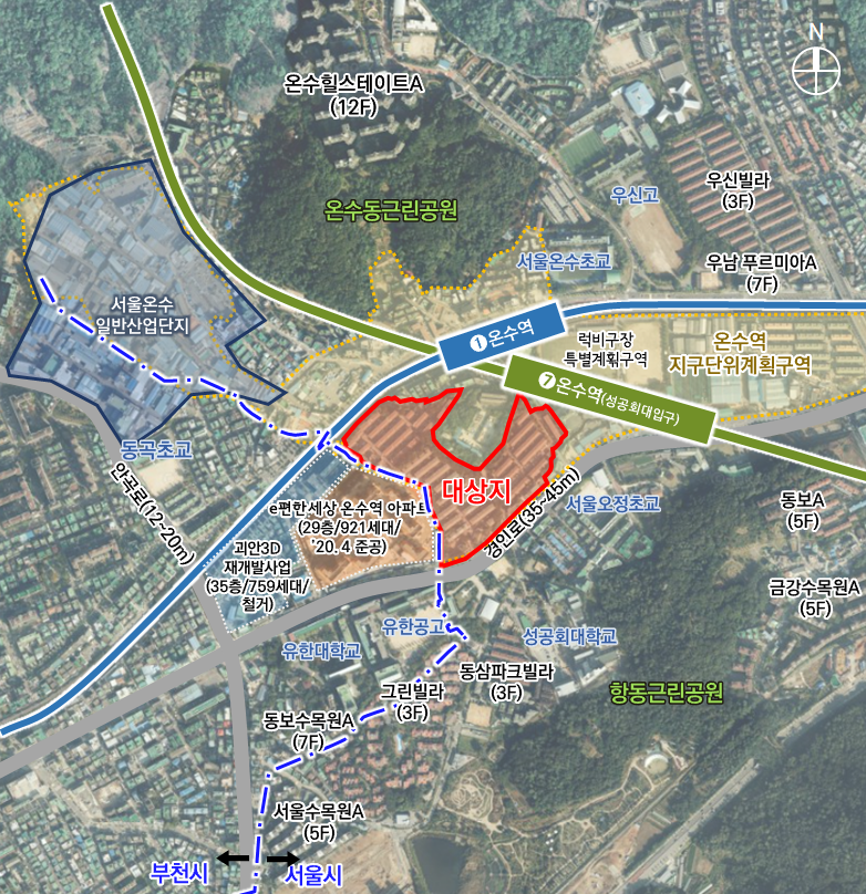 해당 사업지는 온수역(서울 지하철 1·7호선)과 경인로 사이에 있어 교통이 편리한 지역으로, 이번 심의를 통해 1985·1988년 준공된 노후 연립주택(3개 단지, 34개 동, 3층, 741가구)을 아파트(14개 동, 25층, 1148가구(공공주택 81가구))로 재건축하게 됐다. 기존 계획안은 총 988가구 공급이었지만 공공주택을 단지에 포함하기로 결정하면서 법적상한용적률을 적용받을 수 있게 됐기 때문이다.