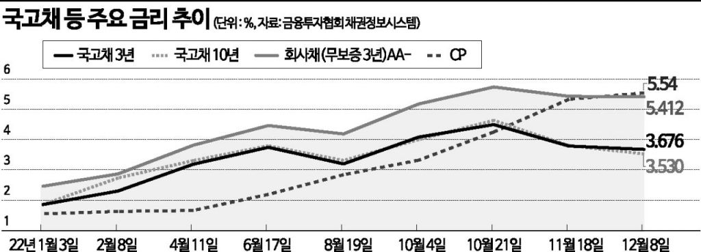 ◆CP·회사채 ‘더딘 투심 개선’= CP(기업어음) 금리가 추세적인 하락세를 보이기까지 시간은 더 필요할 것으로 예상된다. 지난 10월 단기자금 시장 안정을 위해 정부가 대규모 유동성 공급 정책을 가동했지만, CP 금리는 5.54%를 기록, 두 달 전(3.4%), 1월(1.5%) 금리 수준과 비교하면 여전히 높다. CP 금리 상승을 자극한 프로젝트파이낸싱(PF)-자산유동화증권(ABCP) 차환 부담도 이어지고 있다. 투자자들은 만기를 앞둔 15조7000억 규모의 증권사 CP와 17조2000억원 규모의 PF ABCP 차환 물량에 경계감을 높이며 연말 자금 수급 변동성에 주목하고 있다.
