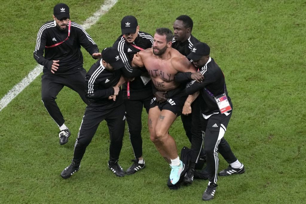 한국시간으로 10일 오전 4시 카타르 루사일 스타디움에서 열린 아르헨티나와 네덜란드의 8강전 도중 러시아의 유명 유튜버인 비탈리 즈도르베츠키가 그라운드로 뛰어들었다가 제지당하고 있다. 사진=AP연합뉴스