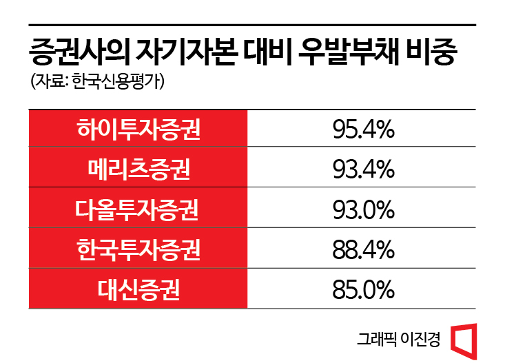 증권사 중에서 자기자본 대비 우발부채 비중이 큰 곳은 대부분 중소형사다. 가장 높은 곳은 하이투자증권이다. 3분기 기준 95.4%(1조3577억원)다. 이어 메리츠증권(93.4%, 5조243억원), 다올투자증권(93.0%, 6460억원), 한국투자증권(88.4%, 5조5381억원), 대신증권(85.0%, 1조7372억원) 등으로 나타났다.