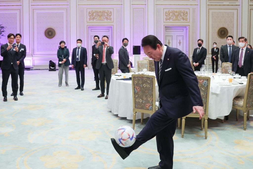 윤석열 대통령이 8일 청와대 영빈관에서 열린 축구 국가대표팀 환영 만찬에서 볼트래핑을 하고 있다. 2022.12.8 [대통령실 제공] [이미지출처=연합뉴스]