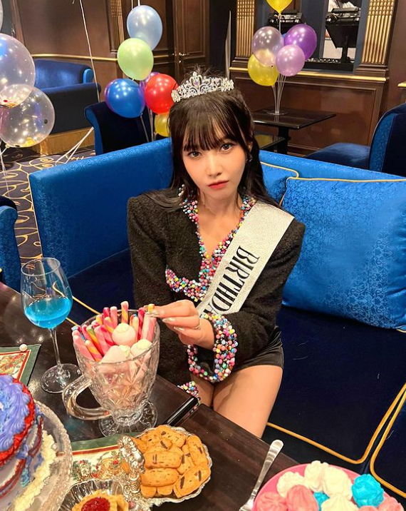 사진 속 조이는 머리에 왕관을 쓰고 카메라 앞에서 포즈를 취하고 있다.