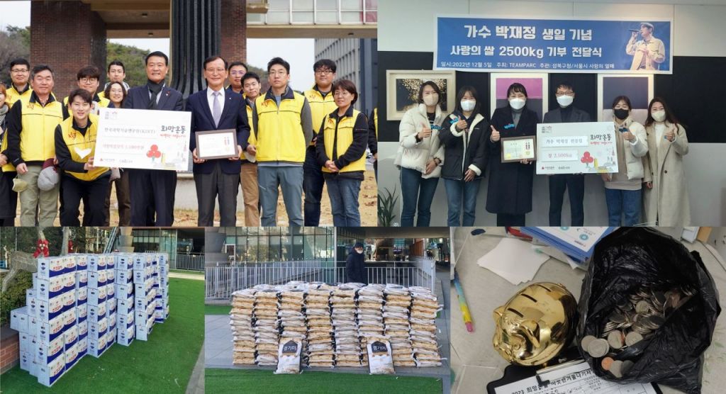 서울 성북구에서 소외이웃의 따스한 겨울나기를 위한 각계각층의 온정이 이어지고 있다. 사진설명(위, 왼쪽부터 시계방향)<br /> 1. 한국과학기술연구원(KIST)이 사랑의 집짓기 후원금 1,500만 원을 전달하고 집수리 자원봉사 활동을 펼쳤다.<br /> 2. 가수 박재정 팬클럽이 사랑의 쌀 2,500kg을 기부했다.<br /> 3. 월곡1동 장선순 어르신은 폐지단가가 급락한 상황에서도 18만350원을 기부해 나눔과 기부의 의미를 한 번 더 돌아보게 했다.<br /> 4.5. 각계 각층에서 따뜻한 겨울나기를 위하여 기부한 쌀, 김장김치