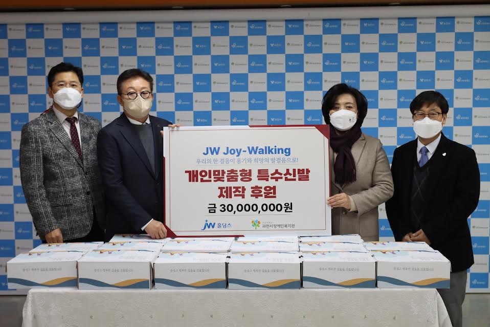 전날 열린 기부금 전달식에서는 한성권 JW홀딩스 대표가 이학준 과천시 장애인복지관장에게 기부금 3000만원을 전달했다. 기부금은 보행이 불편한 장애인들을 위한 특수신발 제작에 쓰인다. 희귀질환, 발달 지연, 중증 장애, 발 모양 변형 등의 원인으로 보행에 어려움을 겪는 장애인들을 위해 개인의 발 모양에 맞춰 특수 제작해 일반 신발보다 편하게 신을 수 있다.