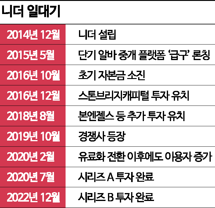 [아시아경제 권재희 기자] 글로벌 금리인상 등의 여파로 자금줄이 마르며 스타트업들의 투자 유치가 어려워진 가운데에도 시리즈B 투자를 성공적으로 마무리지은 업체가 있다. 바로 실시간 아르바이트 매칭 플랫폼 '급구'의 운영사 니더다.