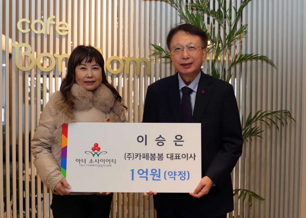 [아시아경제 영남취재본부 구대선 기자] 대구 사회복지 공동모금회는 21일 카페봄봄 이승은 대표이사가 이웃돕기 성금 1억원을 기부하고 대구지역 아너소사이어티 213호 회원으로 가입했다고 전했다.
