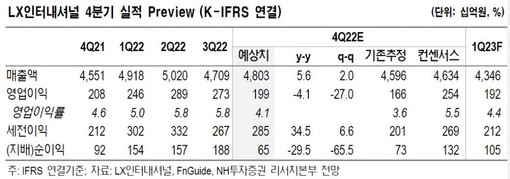 김동양 NH투자증권 연구원은 "LX인터내셔널의 4분기 매출액은 전년 대비 6% 증가한 4조8035억원, 영업이익은 4% 감소한 1991억원으로 시장 컨센서스를 하회할 전망이다"라고 밝혔다.
