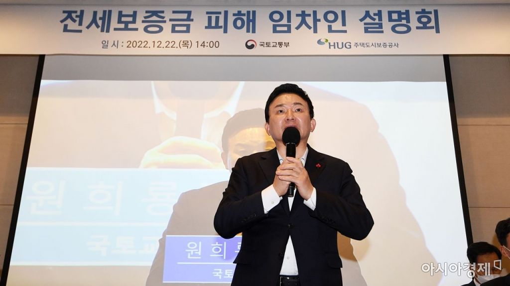 원희룡 국토교통부 장관이 22일 서울 여의도 전경련에서 열린 전세보증금 피해 임차인 설명회에서 인사말을 하고 있다./김현민 기자 kimhyun81@