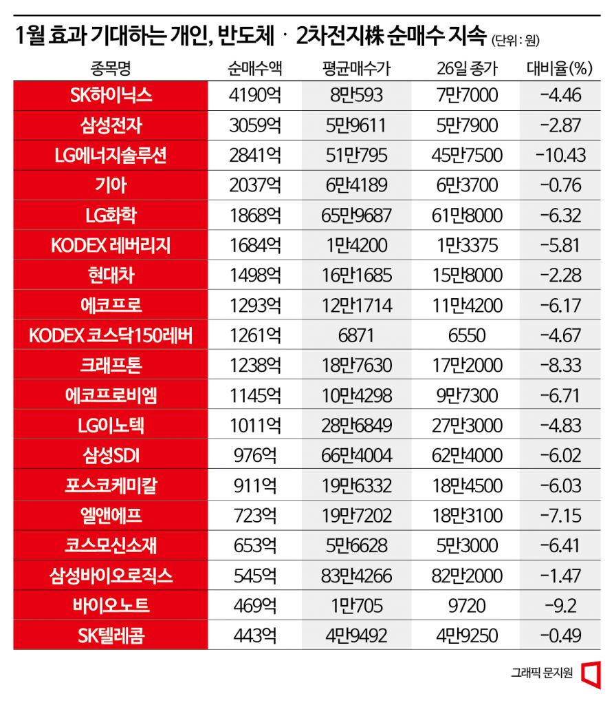 [아시아경제 박형수 기자] 올 들어 코스피와 코스닥 지수가 큰 폭 떨어졌던 만큼 '1월 효과'를 기대하는 개인 투자자가 적지 않다. 1월 효과는 새해에 대한 투자자들의 낙관적 전망이 반영돼 뚜렷한 호재가 없어도 1월의 주가가 다른 달보다 많이 오르는 현상을 뜻하는 말이다. 개인 투자자는 이달 들어 삼성전자와 SK하이닉스 등 올해 지수 하락의 주범인 반도체 업종을 집중 매수하면서 반등 기대감을 나타내다. 다만 전문가들은 증시 전반에 온기가 돌 정도로 낙관적인 상황은 아니라며 당분간 관망할 것을 당부했다.