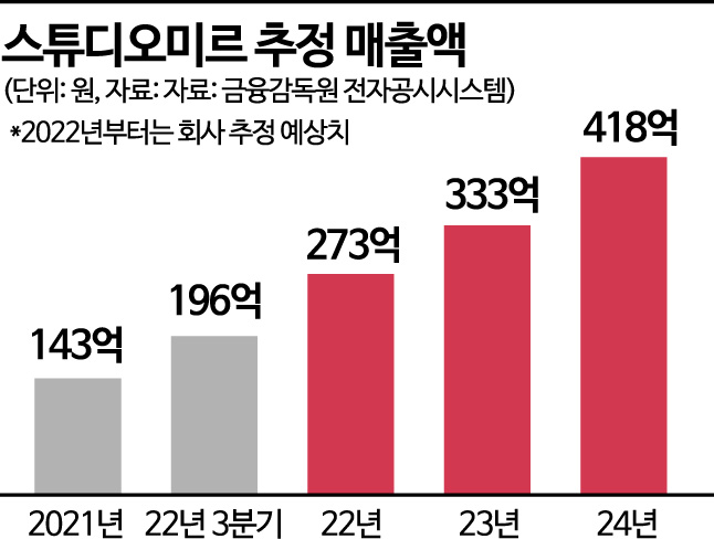 글로벌 OTT로부터 제작 문의가 늘어나면서 매출은 개선세를 이어갈 것으로 보인다. 3분기 기준 이 회사 매출액은 196억원으로 지난해 연간 매출액(144억원) 대비 50억원가량 증가했다. 같은 기간 영업이익은 지난해 비용 증가에 따른 영업손실 19억원에서 27억원 흑자로 돌아섰다. 예상 매출액은 내년엔 333억원, 2024년엔 418억원으로 뛰어오를 것으로 예측됐다.