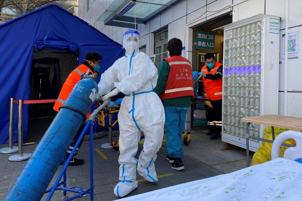 23일 중국 베이징의 한 발열진료소에서 간호사가 산소 탱크를 실어나르고 있다. 사진=로이터·연합뉴스