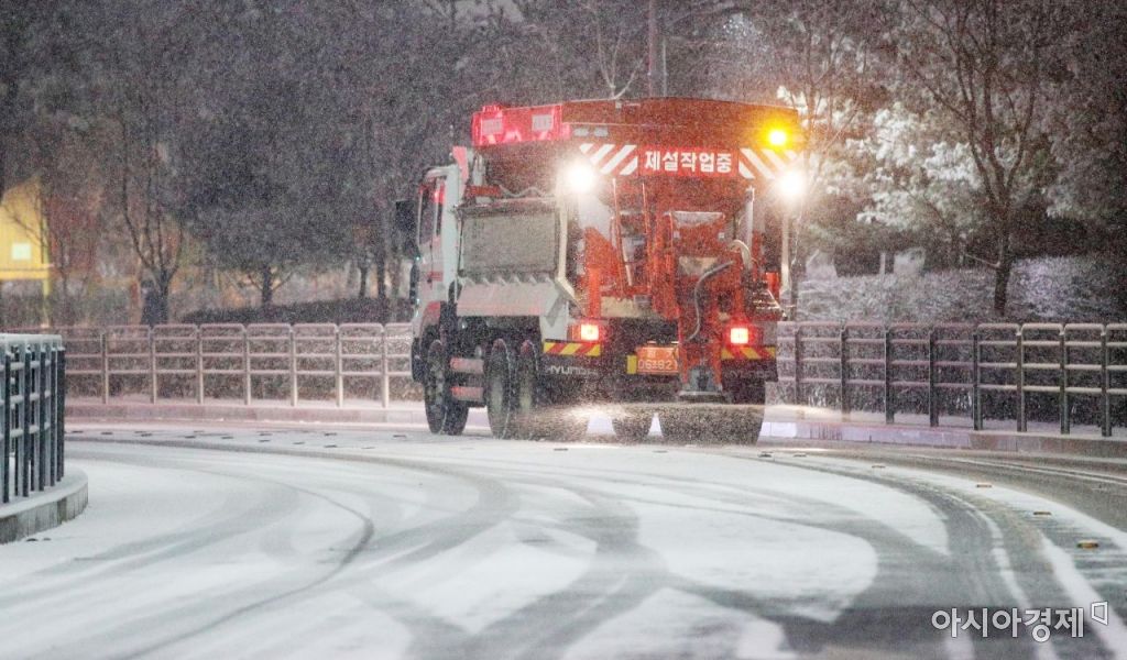 서울 전역에 대설주의보가 발효된 3일 서울 강서구의 한 제설차량이 염화칼슘을 뿌리며 지나가고 있다./김현민 기자 kimhyun81@