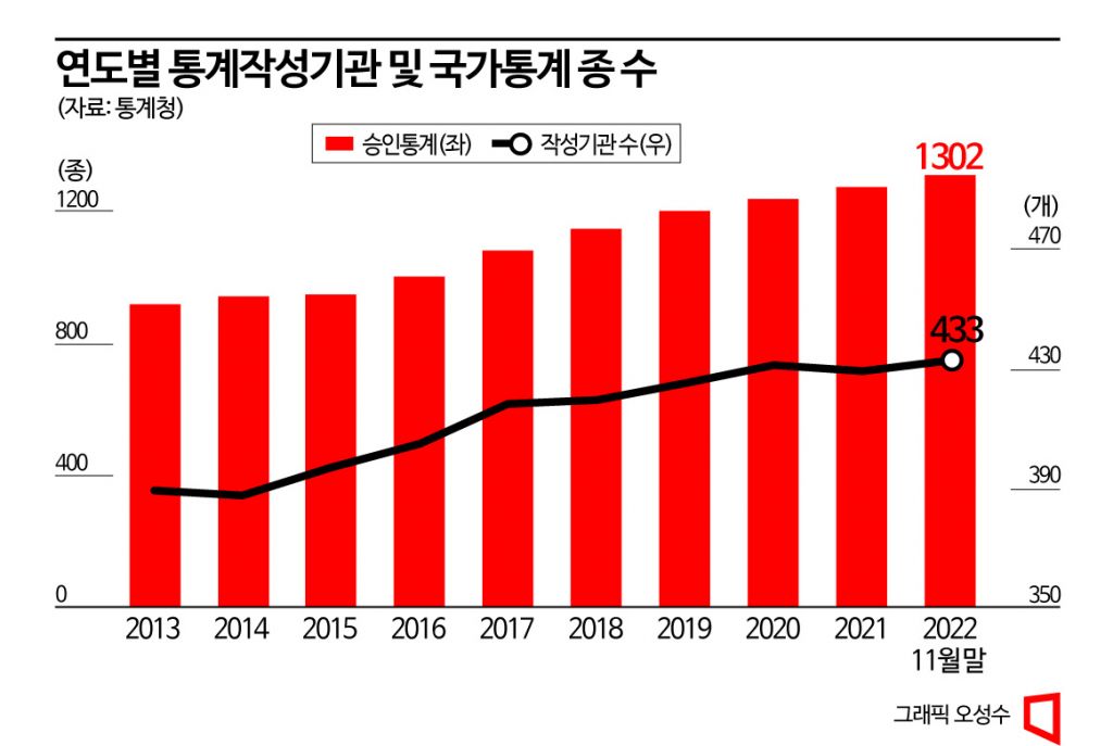 한편 이번 기본계획에는 국가통계 현황도 담겼다. 올해 국가승인 통계는 1302종으로 제1차 국가통계 발전 기본계획이 시작됐던 2013년(922종) 대비 41.2% 늘었다. 올해 통계작성기관은 333개로, 작성기관 당 평균 작성 통계 수는 3종으로 집계됐다.