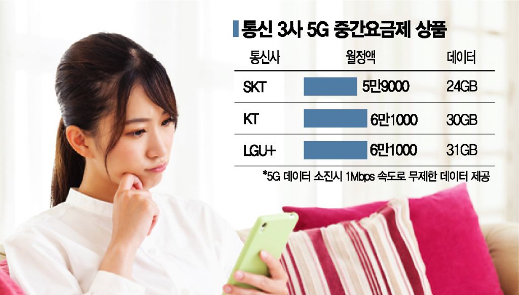 통신 3사는 지난 8월 5만~6만원대에 월 24~31GB 데이터를 제공하는 5G 중간요금제를 출시했다. 이용자 반응은 미적지근하다. 업계에 따르면 중간요금제 출시 약 2달 뒤인 10월 말 기준 가입자는 전체 5G 가입자의 1%를 웃도는 수준이다. 과기정통부 '무선데이터 트래픽 통계'에 따르면 10월 말 기준 5G 가입자당 트래픽은 약 28.1GB로 소비자 수요를 충족시키지 못한다는 지적이 나온다.