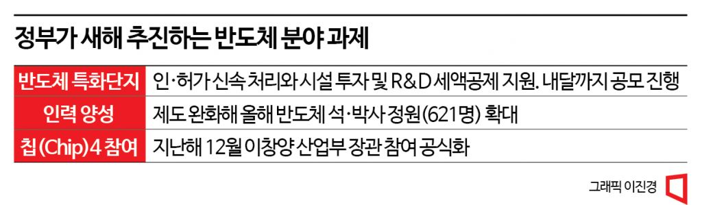 정부가 새해부터 추진하는 반도체 관련 주요 사업으로는 반도체 특화단지 조성이 있다. 특화단지 조성 관련 인허가 신속 처리와 인프라 등 기반 시설 구축 및 인력 양성을 지원하고 시설 투자와 연구·개발(R&D) 관련 세액공제를 제공하는 내용을 담고 있다. 반도체 업계에선 그간 특화단지 조성으로 사업 혜택이 늘어날 것을 기대했다. 반도체 특화단지를 유치하려는 인천과 부산, 경북, 광주·전남 등 여러 지방자치단체가 경쟁 과정에서 지원책을 쏟아내는 상황이었기 때문이다.