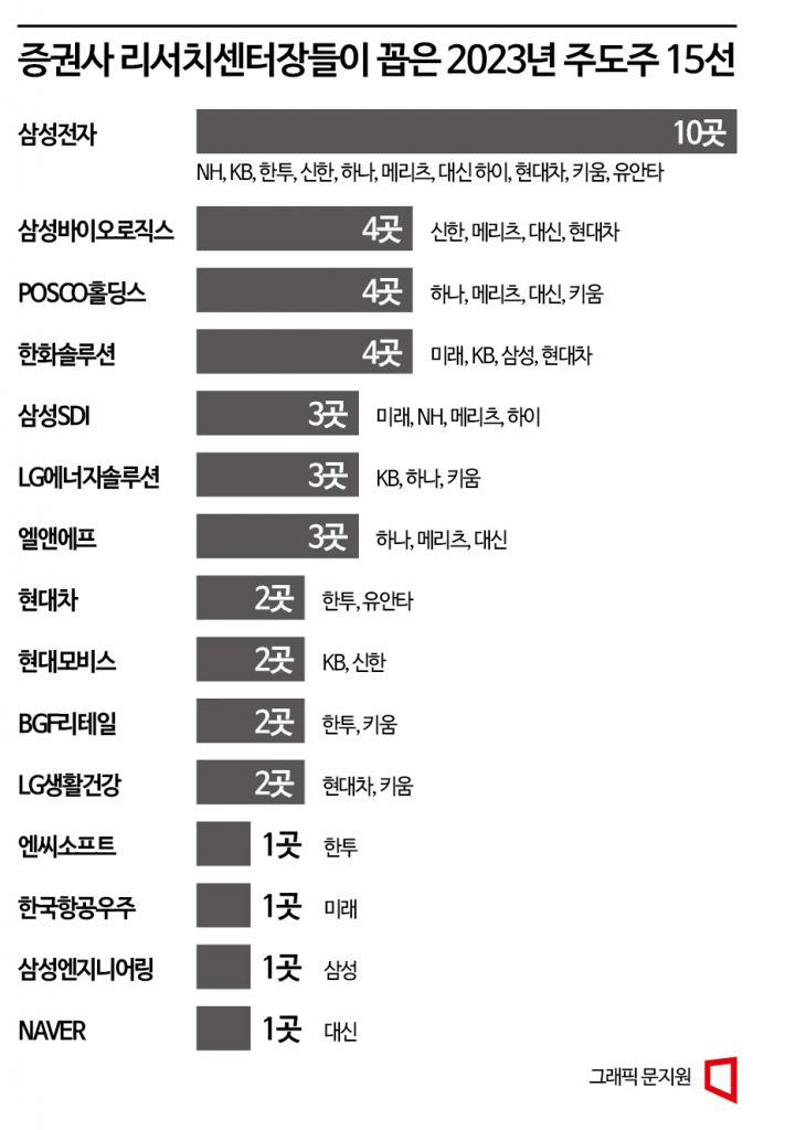 [아시아경제 임정수 기자, 이민지 기자, 이정윤 기자] 리서치센터장들은 새해 증시를 이끌 주도주로 삼성전자·삼성바이오로직스·POSCO홀딩스·한화솔루션·LG에너지솔루션·삼성SDI·현대차·현대모비스·엘앤에프·한국항공우주(KAI)를 꼽았다.