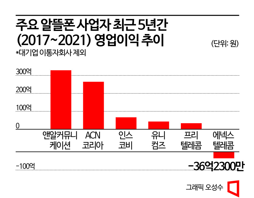 9일 과학기술정보통신부가 윤영찬 더불어민주당 의원실에 제출한 자료를 보면 매출 기준 알뜰폰 시장 점유율 1% 이상인 사업자 중 최근 5년간(2017년~2021년) 적자를 낸 곳은 22곳 중 7곳에 불과하다. 중소 알뜰폰 사업자만 놓고 보면 적자를 기록한 곳은 에넥스텔레콤 1곳뿐이다. 나머지는 모두 수백억원대의 흑자를 기록했다. 이 기간 앤알커뮤니케이션과 ACN코리아의 영업이익은 각각 328억7900만원, 264억5300만원이었다.