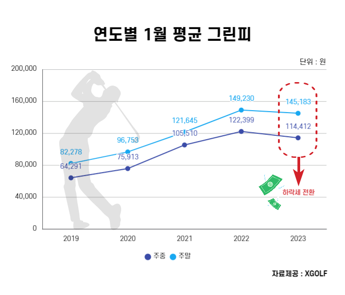 매년 지속해서 상승하던 그린피는 2023년을 기점으로 수그러드는 모양새다. 올해 1월 그린피 평균은 주중 11만4000원, 주말 14만6000원으로 전년 대비 주중 6.5%, 주말 2% 각각 하락했다. XGOLF 관계자는 그린피 하락세의 원인을 경기침체로 인한 골프인구 이탈에 대한 우려와 지난달 30일부터 시행된 '대중형 골프장 지정에 관한 고시'에 의한 것으로 파악했다.