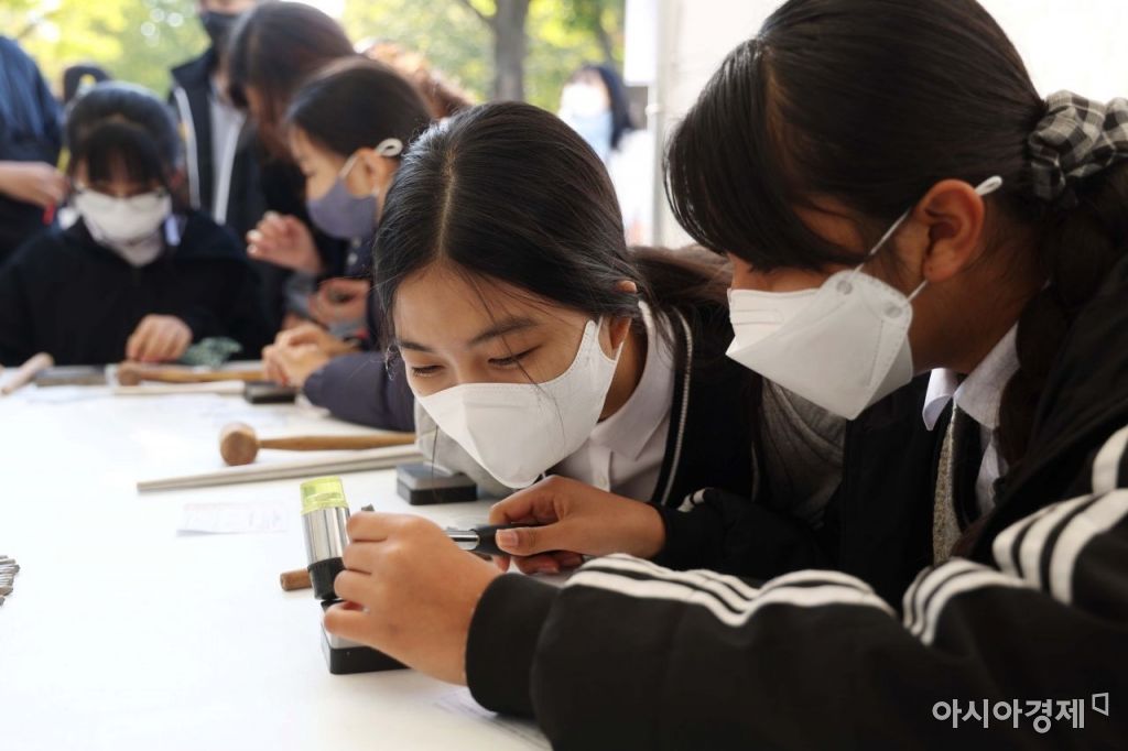 19일 서울 대학로 마로니에공원에서 열린 2022 종로구 청소년 진로직업박람회에서 학생들이 은반지 만들기 체험을 하고 있다. /문호남 기자 munonam@