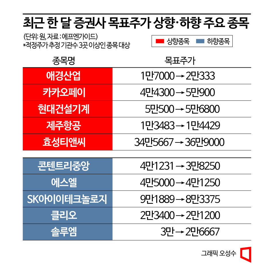 이들과 달리 기대에 미치지 못하는 실적이 예상돼 증권사들이 목표주가를 하향 조정한 곳도 있다. 최근 한 달 새 목표주가가 가장 많이 떨어진 곳은 솔루엠(-11.11%)이다. 그 뒤를 클리오(-9.4%)·SK아이이테크놀로지(-9.27%) 등이 이었다.