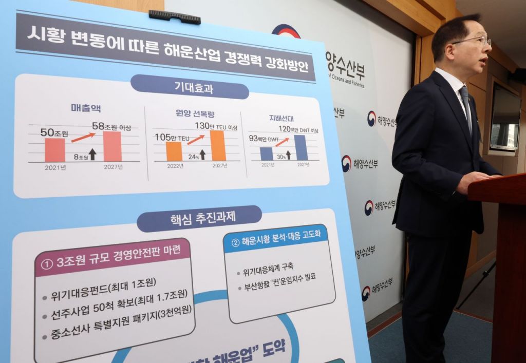 3조원 규모의 해운 경영 안전판도 마련한다. 1조원 규모의 위기대응펀드, 3000억원 규모의 경영안정자금을 마련하고 선박의 해외 헐값 매각을 막기 위한 공공 선주사업 등을 추진한다. 국적 해운사의 수송력을 높이기 위해 선복량을 2027년까지 1억2000만t으로 지난해(9300만t) 대비 30%가량 확충한다.