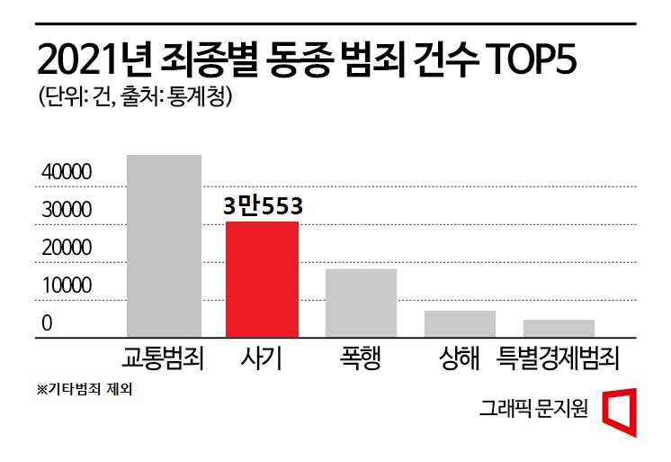 5일 통계청 ‘재범자 재범종류 및 기간’에 따르면 2021년 사기 범죄의 동종 재범은 3만553건으로 교통 범죄(4만7996건) 다음으로 많았다.