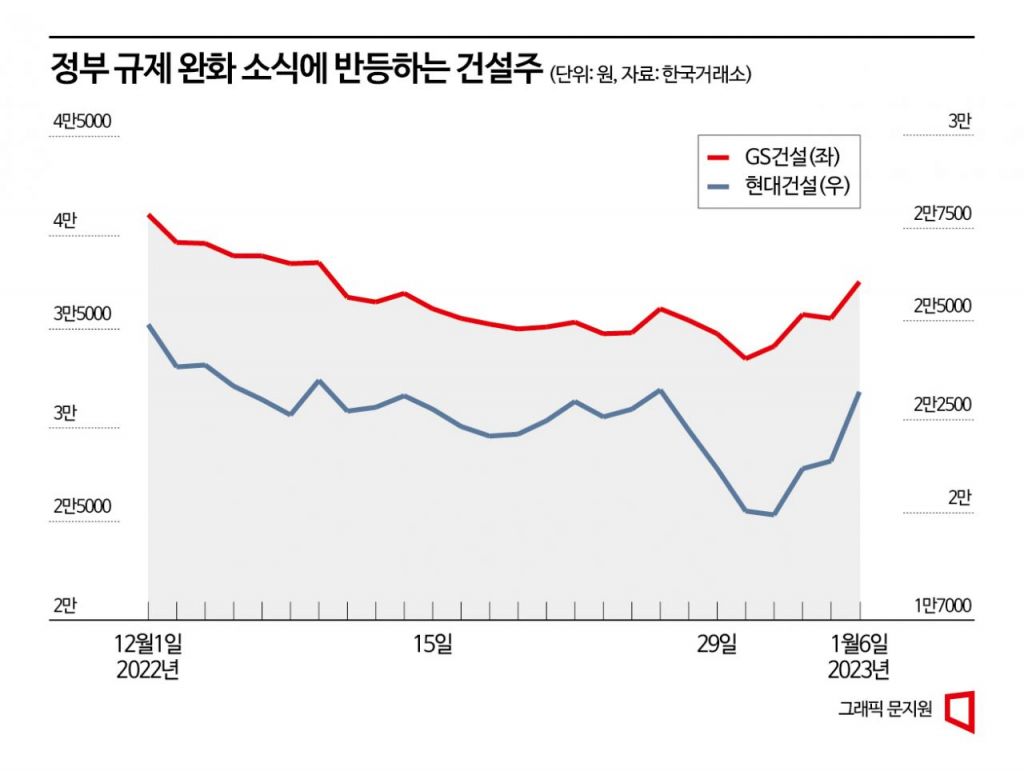 다만 정부가 부동산 규제를 완화한다고 해도 부동산 경기 회복까지는 시간이 걸릴 것으로 보인다. 건설업종의 투자심리가 살아나면서 주가가 반등했지만 추세적인 상승으로 이어지려면 고금리 기조가 바뀌어야 하기 때문이다. 고금리 기조가 꺾이지 않는다면 규제 완화에 따른 주택 실거래량 회복은 제한적일 가능성이 크다. 김선미 신한투자증권 연구원은 "주택시장은 당분간 더딘 흐름을 이어가겠으나 건설업종 주가는 2월 이후 안정화될 것"이라며 "2월 이후 주택지표 개선을 기대하기 때문"이라고 말했다.
