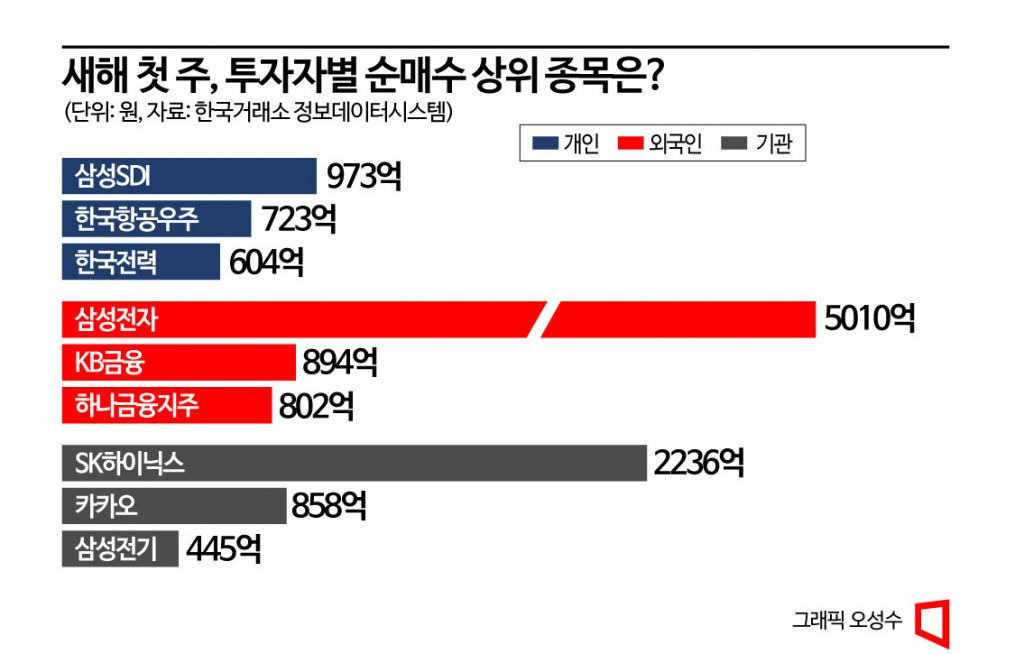 9일 한국거래소 정보데이터시스템에 집계된 투자자별 순매수 현황에 따르면 새해 첫주 5거래일(1월2~6일) 동안 외국인 순매수 1위 종목은 삼성전자로, 순매수 거래대금만 5010억원을 기록했다. 이어 KB금융(894억원), 하나금융지주(802억원), 신한지주(669억원) 순이었다. 외국인 투자자들의 삼성전자 순매수 거래대금은 2위인 KB금융의 5.6배 수준일 정도로 압도적으로 많았다.