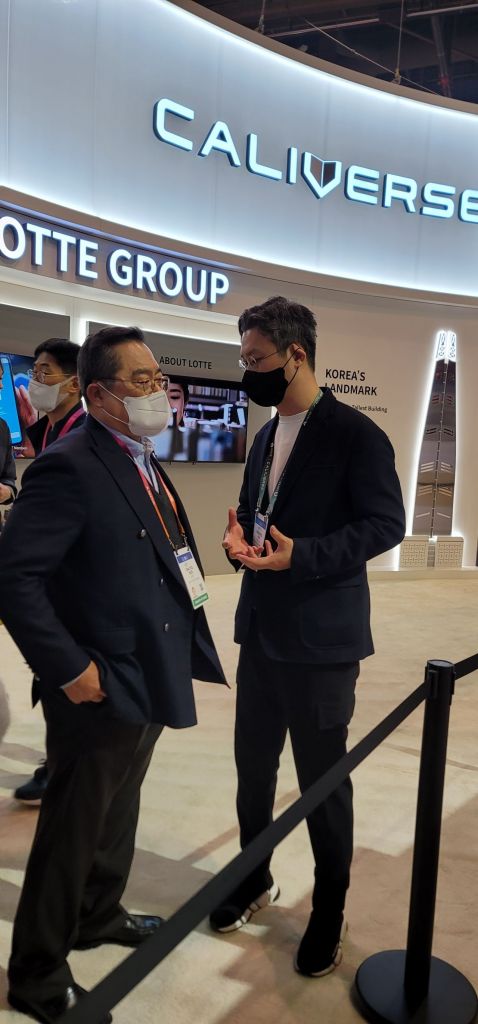 구자열 한국무역협회장이 세계 최대 전자·IT 박람회 CES 2023 개막일인 5일(현지시간) 미국 라스베이거스 컨벤션센터(LVCC) 중앙홀에 마련된 롯데정보통신 전시존에서 김동규 칼리버스 대표에게 메타버스에 관한 설명을 듣고 있다. 롯데정보통신 자회사 칼리버스는 메타버스 전문 기업이다. 2년 연속 CES에 참가한 롯데정보통신은 전년 대비 3배 이상 규모를 키운 전시관(130평·432㎡)을 차렸다. 메타버스 서비스와 헬스케어 통합 플랫폼 등을 공개했다.