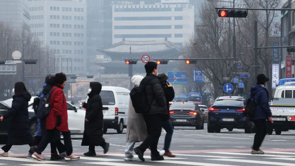 서울의 초미세먼지와 미세먼지 농도가 각각 매우 나쁨과 나쁨을 기록한 7일 서울 도심에서 시민들이 횡단보도를 건너고 있다. [이미지출처=연합뉴스]