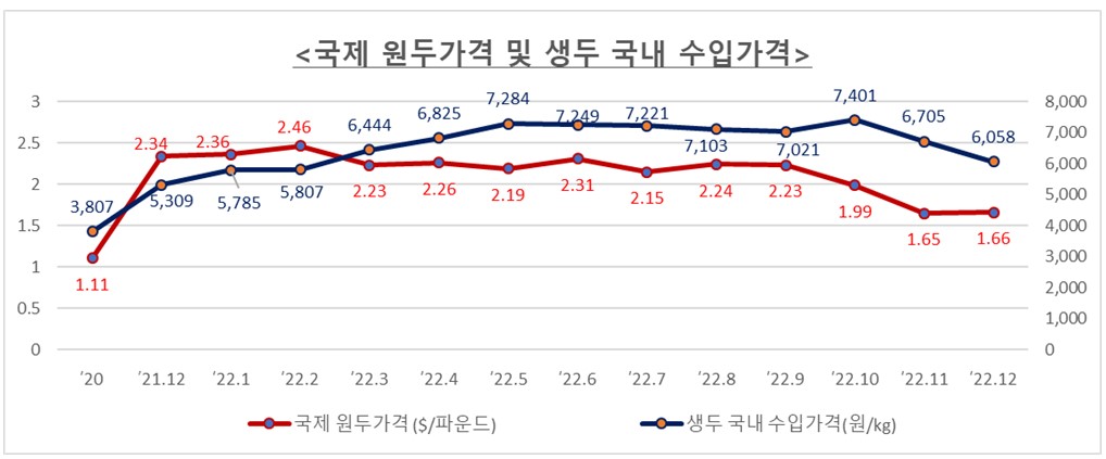 커피협회와 생두 수입 유통사는 "그동안 높은 국제 원두 가격과 환율 급등으로 원가 압력이 컸으나 지난해 12월부터 부담이 확연히 완화됐다"고 전했다.
