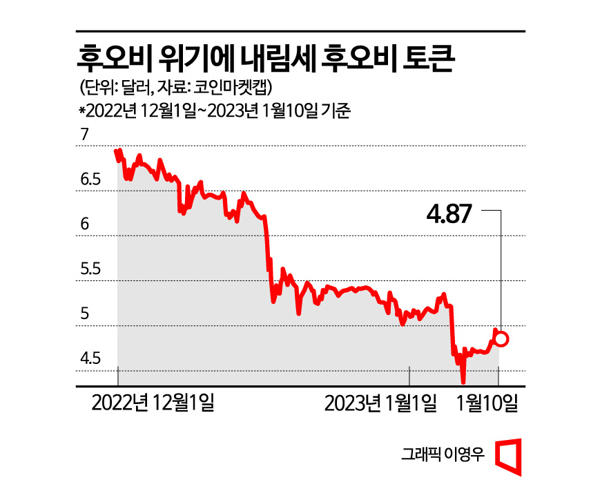 글로벌 글로벌 가상자산 시황 중계 사이트 코인마켓캡에 따르면 10일 후오비 토큰은 지난달 초보다 29.73% 내린 4.87달러(약 6085원)로 집계됐다. 이날 1%대의 오름세를 보였지만 후오비 토큰은 지난달 16일과 이달 5일을 기점으로 가파른 하락세를 기록했다. 이달 6일에는 지난해 11월21일 이후 가장 낮은 4.3달러로 내리기도 했다.