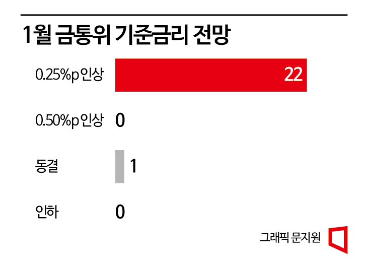 강승원 NH투자증권 FICC리서치부 연구원은 "이창용 한은 총재가 이미 0.25%포인트 인상의 신호를 충분히 보낸 바 있어 1월 금리동결의 실익이 없을 것"이라며 "기자회견을 통해 추가 금리인상의 가능성은 열어두겠지만 사실상 이번 0.25%포인트 인상이 마지막이 될 것"이라고 예상했다. 홍춘욱 프리즘투자자문 대표는 "수출 경기의 급격한 붕괴, 부동산 시장의 패닉을 감안할 때 최종금리는 3.5%에서 결정될 것"이라고 언급했다.