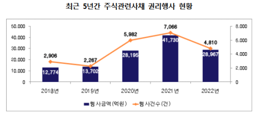 종류별 권리행사 건수를 보면 CB가 2627건으로 전년 대비 42.1% 감소했다. EB는 124건으로 전년 대비 55.4% 감소했고 BW는 2059건으로 8.5% 줄었다.