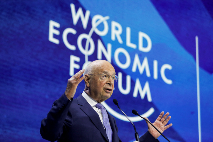 클라우스 슈밥 세계경제포럼(WEF) 회장이 지난해스위스 다보스에서 열린 WEF 연차 총회 개막식에서 연설하고 있다. 사진제공=로이터·연합뉴스