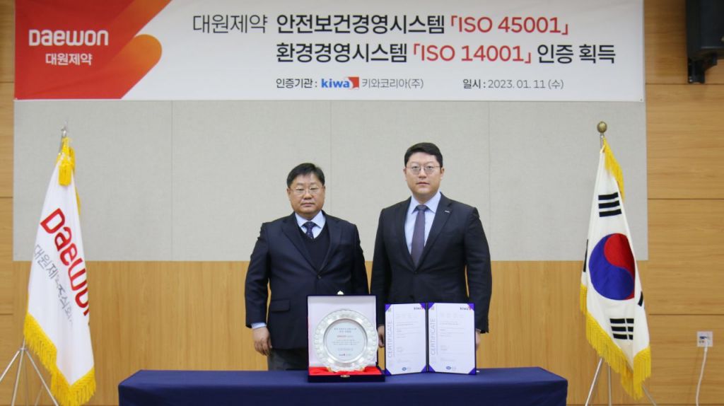백인환 대원제약 사장(오른쪽)과 ISO 인증기관인 키와코리아의 이승찬 대표가 ISO 인증 수여식에서 기념촬영을 하고 있다. [사진제공=대원제약]