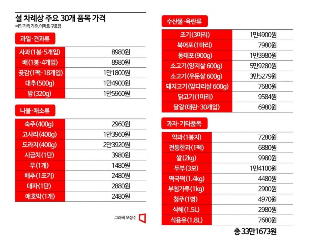 설 차례상 구매비용이 얼마나 드는지 직접 장보기를 해본 결과, 총비용은 33만1673원에 달했다. 주요 품목 30개를 4인 가족 기준으로 구매했기 때문에 실제 차례상 비용은 대형마트 이용 시 40만원에 육박할 것으로 예측된다. 품목별로 살펴보면 과일·견과류는 사과(1봉·5개입) 8980원, 배(1봉·4개입) 8980원, 곶감(1팩·18개입) 1만1800원, 대추(500g) 1만4900원, 밤(320g) 1만5960원으로 나타났다. 나물·채소류는 숙주(400g) 2960원, 고사리(400g) 1만3960원, 도라지(400g) 2만3920원, 시금치(1단) 3980원, 무(1개) 1480원, 배추(1포기) 2480원, 대파(1단) 2880원, 애호박(1개) 2480원이었다.